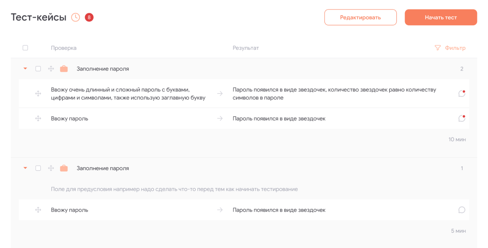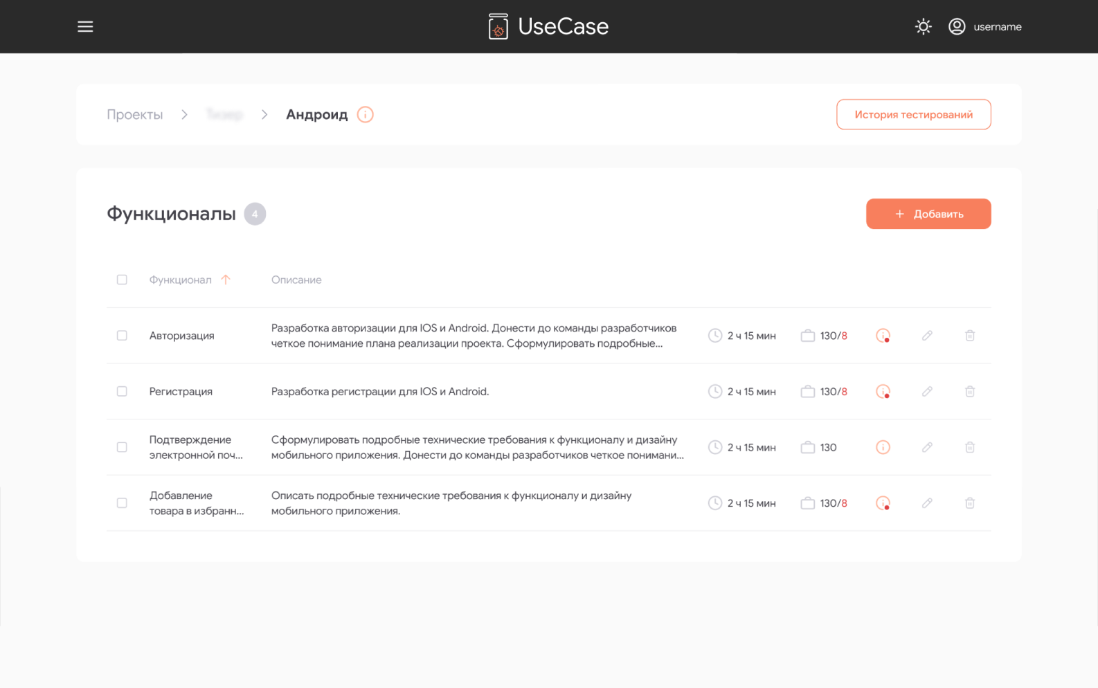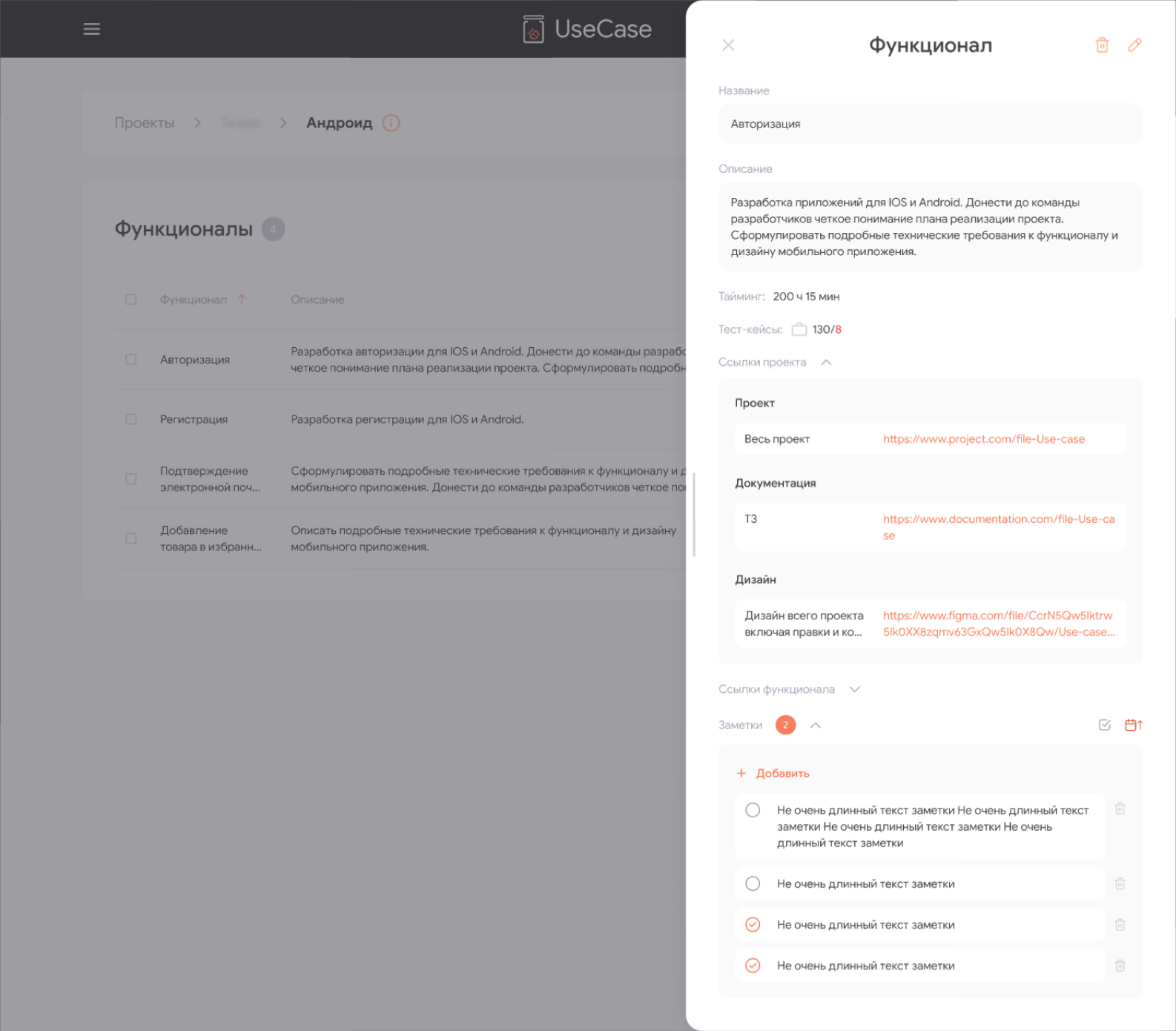 В списке функционалов отображается его информация, кол-во кейсов внутри (если рядом с кол-вом кейсов отображается красная цифра, значит внутри есть кейсы с пометками «Обратить внимание»), наличие заметок (красный бейдж на иконке информации о функционале) и кол-во времени, которое потребуется на прохождение всех кейсов. Время заполняется к каждому кейсу отдельно, а в таблице функционалов отображается суммарное время по всем кейсам.