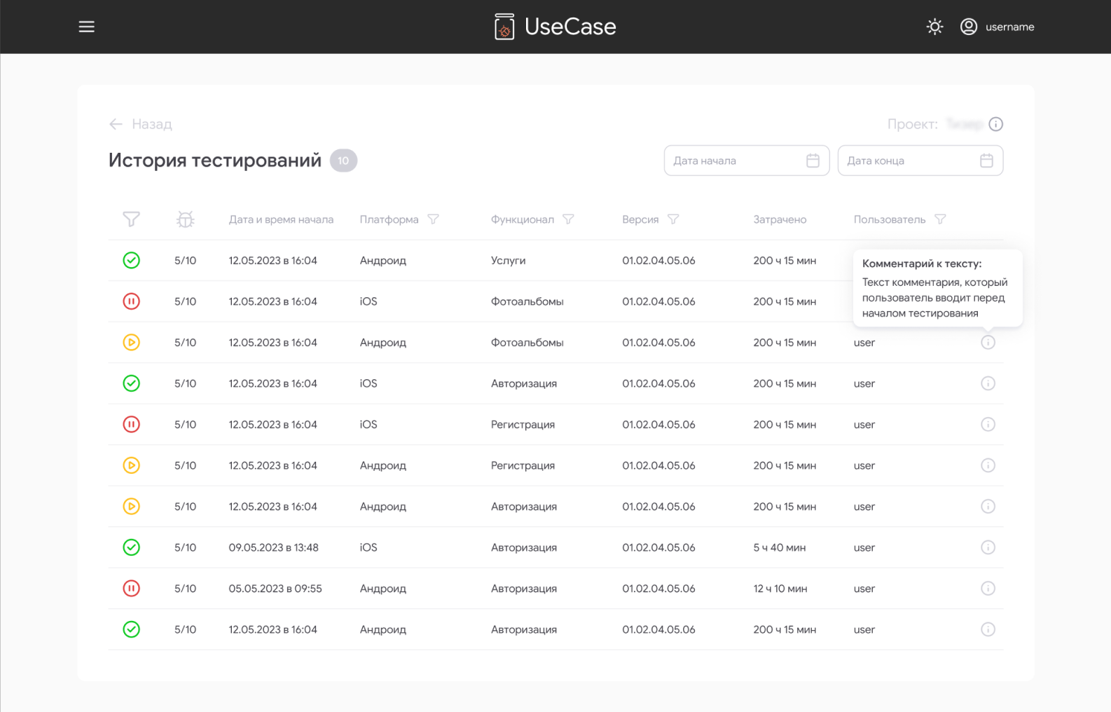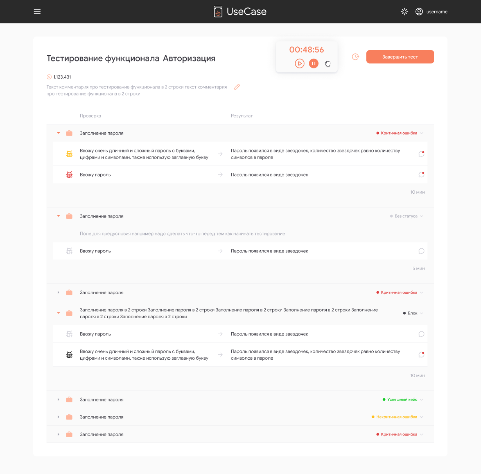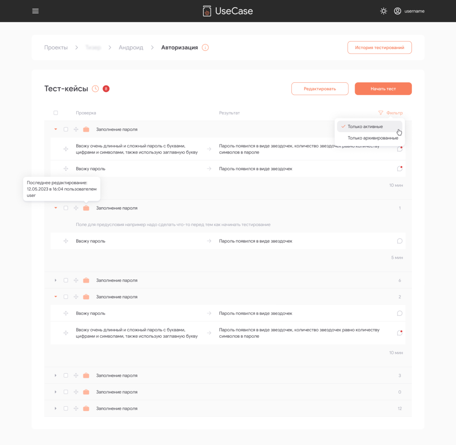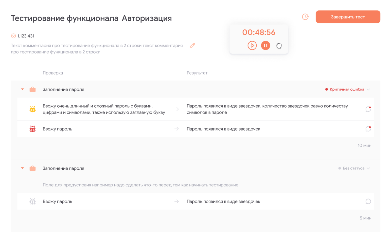 В списке функционалов отображается его информация, кол-во кейсов внутри (если рядом с кол-вом кейсов отображается красная цифра, значит внутри есть кейсы с пометками «Обратить внимание»), наличие заметок (красный бейдж на иконке информации о функционале) и кол-во времени, которое потребуется на прохождение всех кейсов. Время заполняется к каждому кейсу отдельно, а в таблице функционалов отображается суммарное время по всем кейсам.