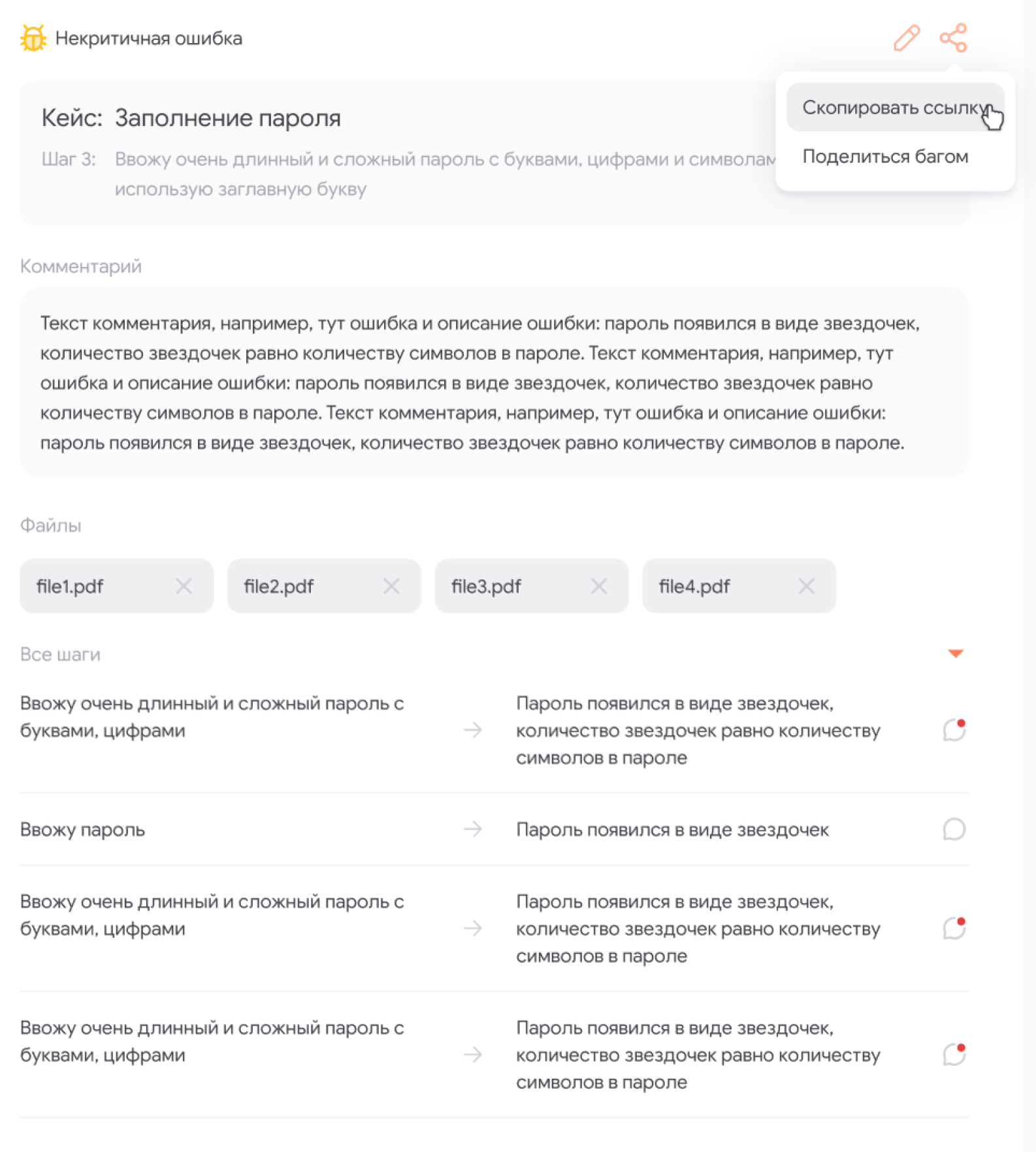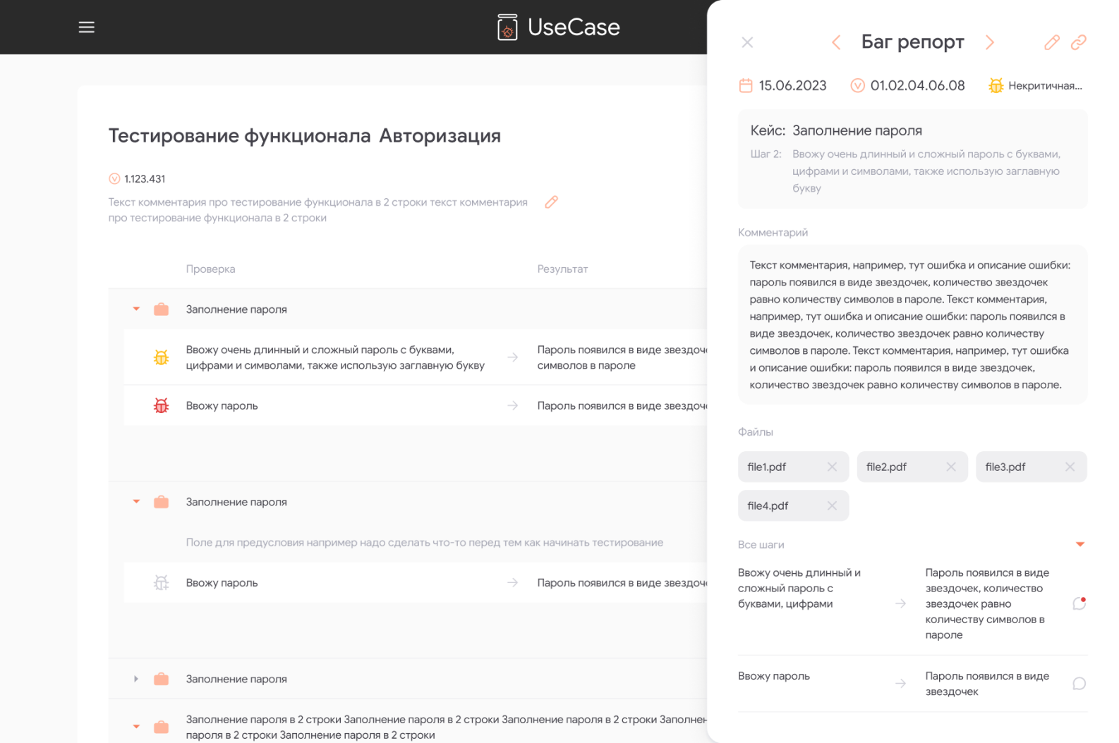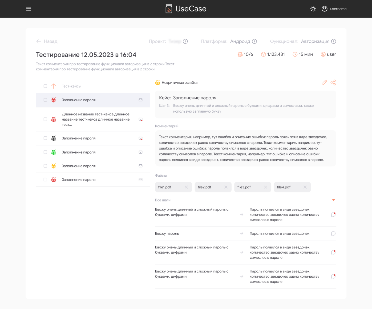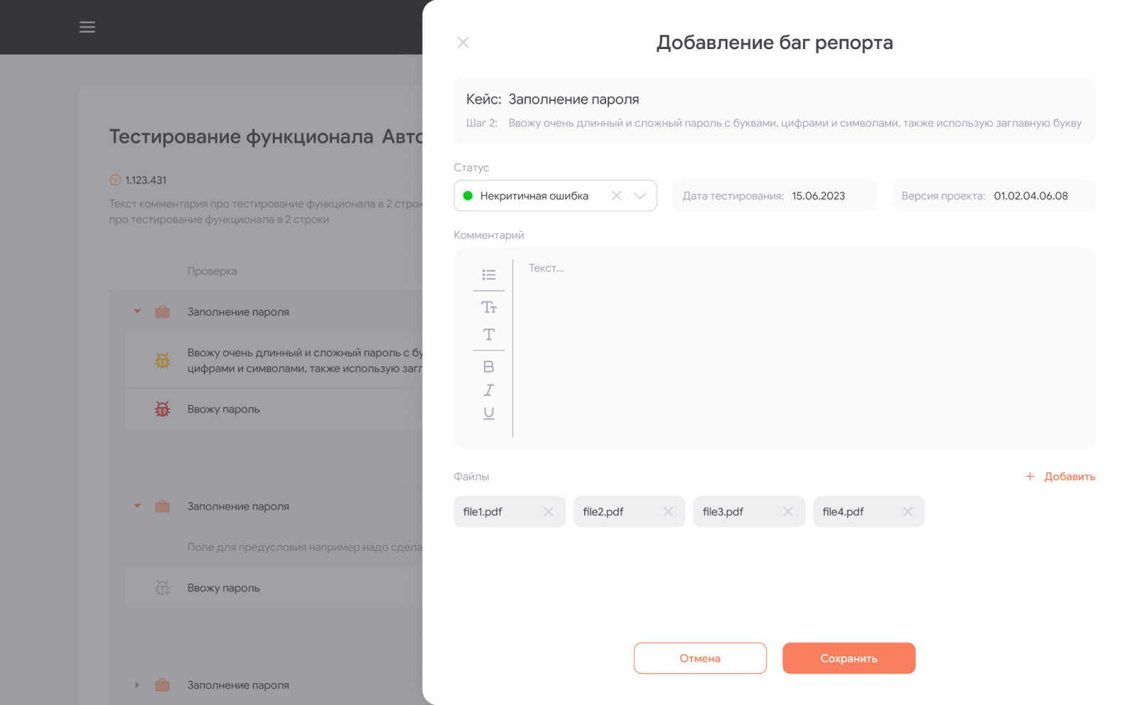 Предположим, что функционал новый и ещё не полностью описан: тестировщик добавляет себе заметку «Закончить описание функционала» — данная пометка будет отображаться в родительских структурных моделях (проекты и платформы), что позволит не забывать о том, что тут надо актуализировать информацию. В панели просмотра функционала отображается список заметок в формате чекбокса.
